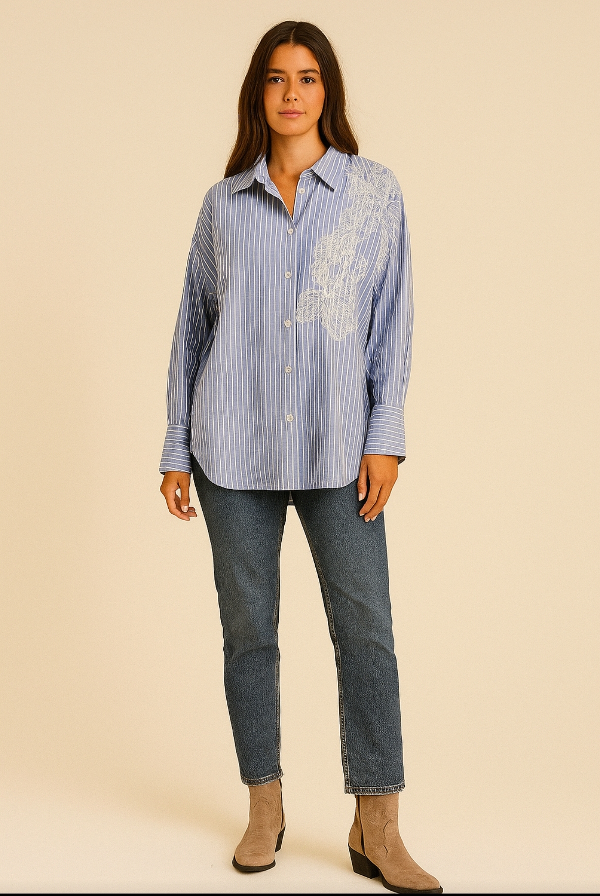 CAMISA AZUL RAYAS BLANCAS, MANGA LARGA Y DETALLE FLORAL BORDADO EN BLANCO EN EL LATERAL DERECHO. TALLA S/M, 36-40.