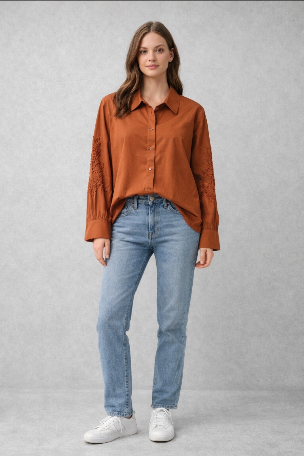 CAMISA COLOR TEJA DE MANGA LARGA CON DETALLES EN LAS MANGAS.