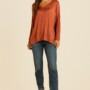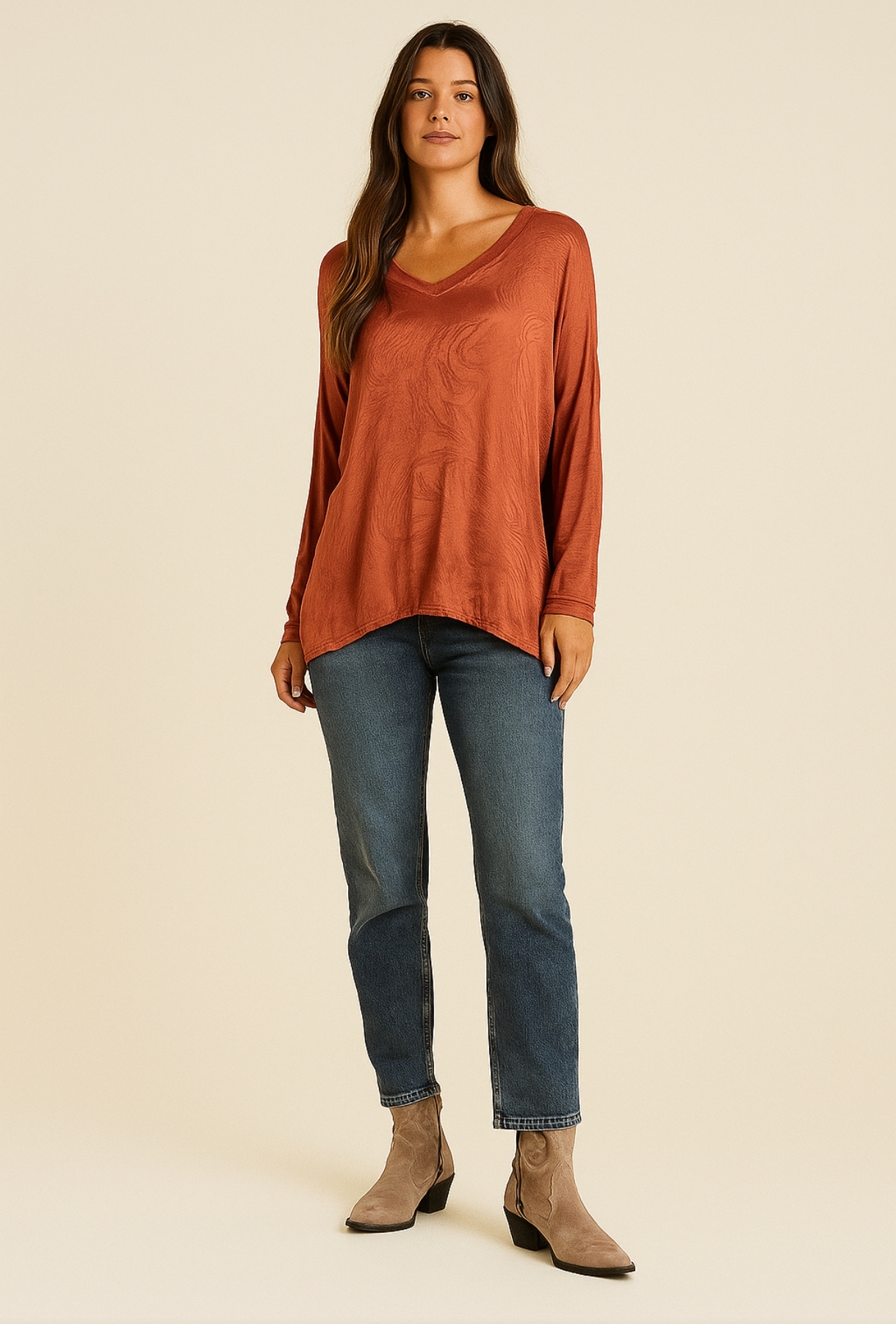 CAMISETA TERRACOTA CON ESTAMPADO FRONTAL HACIENDO AGUAS, ESCOTE DE PICO Y MANGA LARGA. TALLA ÚNICA DESDE 36-42.