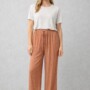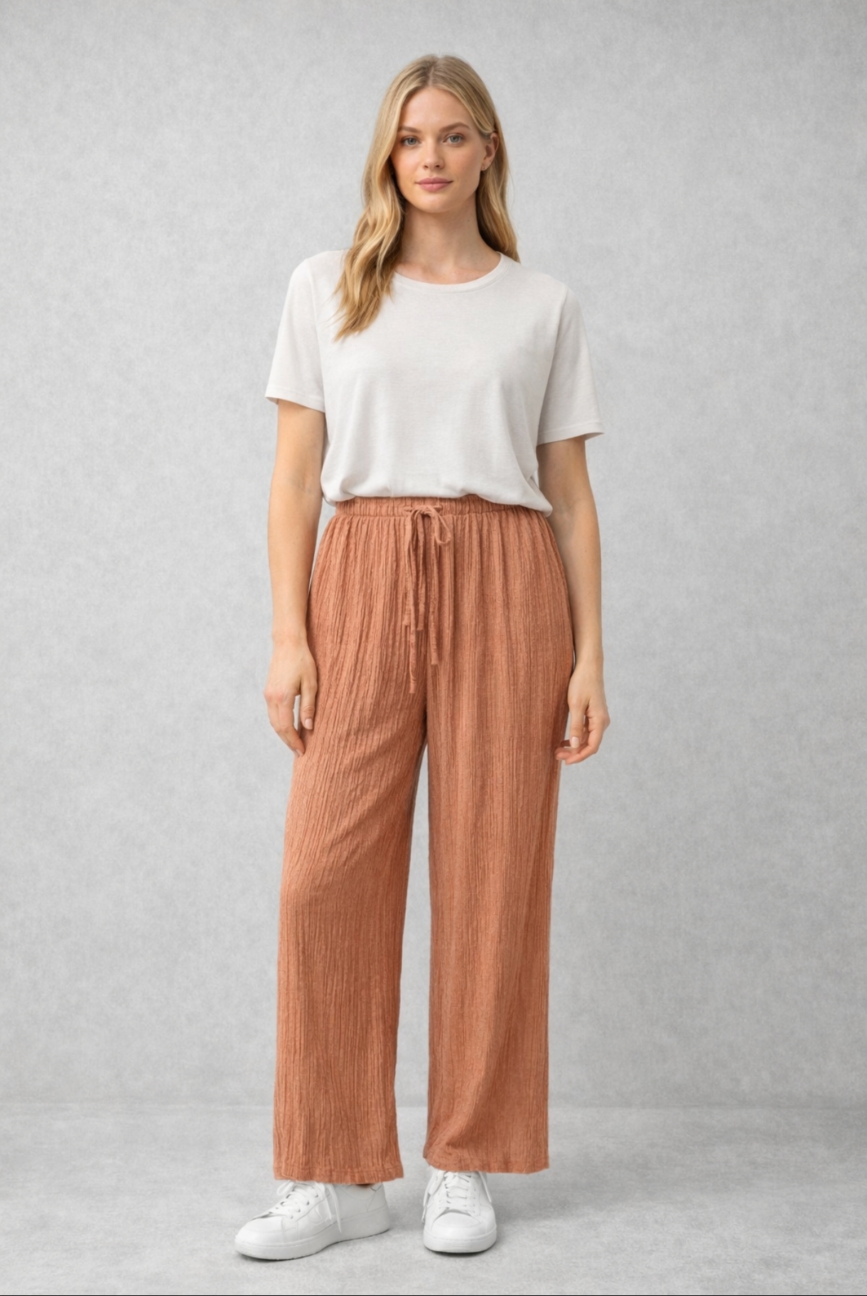 PANTALÓN PALAZZO TEXTURA ARRUGADA EN COLOR NARANJA PASTEL.