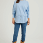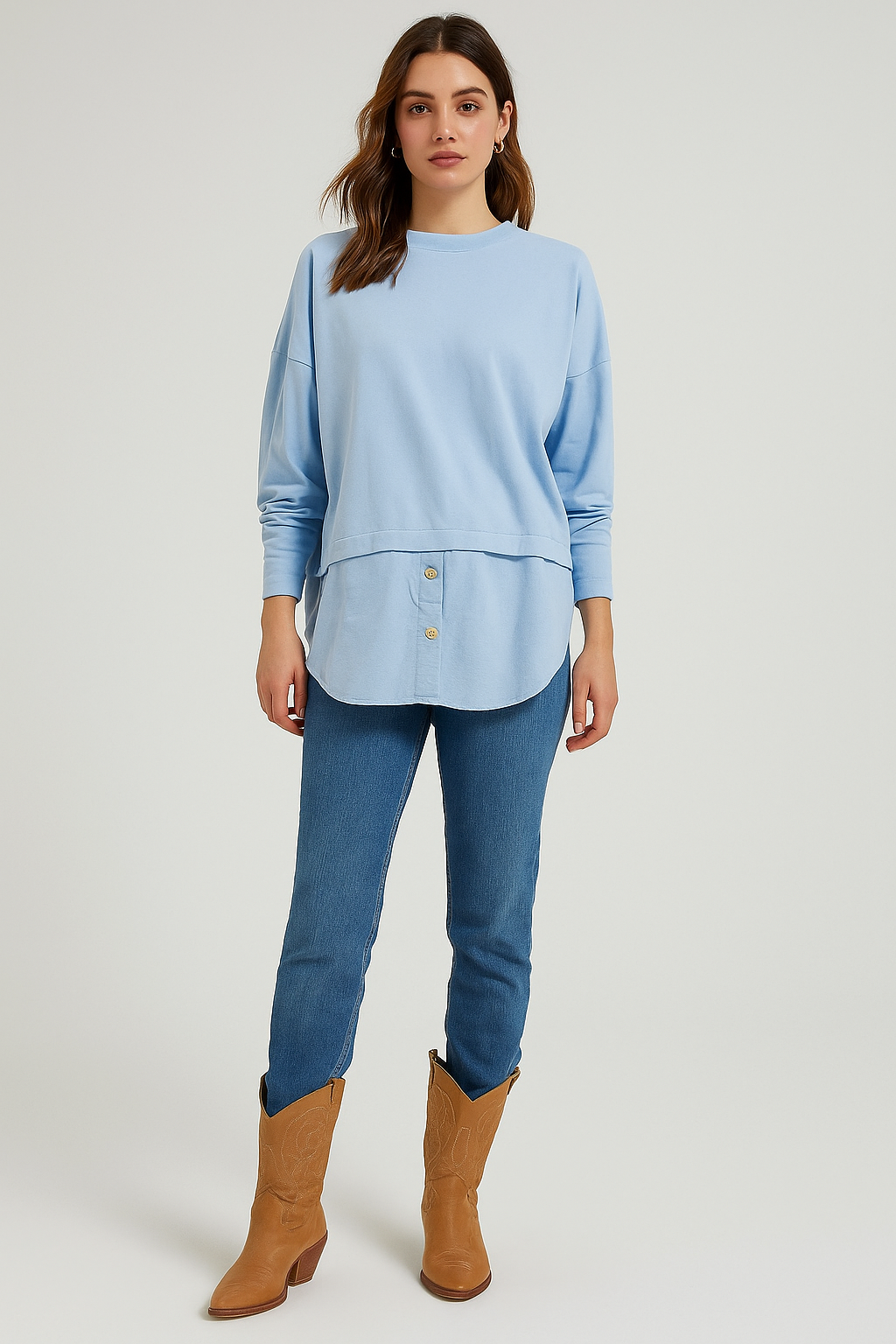 SUDADERA FINA AZUL CIELO CON BAJO CAMISERO, DETALLE DE BOTONES EN BAJO. TALLA ÚNICA DESDE 36-42.