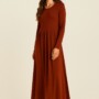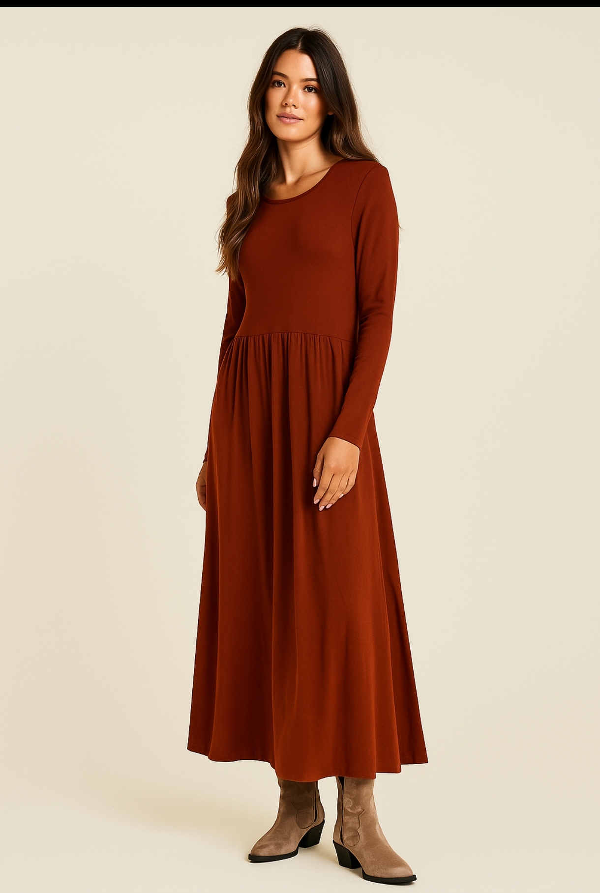 VESTIDO LARGO TERRACOTA, ESCOTE REDONDO, MANGA LARGA, EN DOS TIPOS DE TELA, CANALÉ HASTA LA CINTURA Y ALGODÓN POPELÍN DE CINTURA AL BAJO.